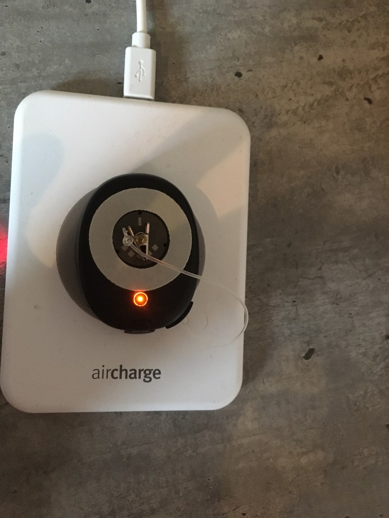 ***Sur une paillasse grise est posé un socle de charge tout plat. Le processeur (aimant oval) est posé sur le socle, un petit voyant rouge/orange indique qu’il est en charge***